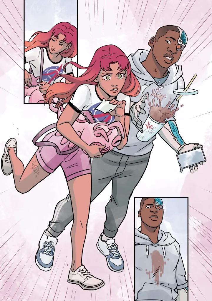 “They have so much in common, because another aspect is when they become friends, Cyborg is very estranged from his father and has a very, as in canon, has a very fraught relationship with his father. And even though Starfire lives with her mom, you know, her mom is kind of this absent figure. She’s very wrapped up in her engagement to a new character we introduce, and she doesn’t pay a lot of attention to the girls. Now Starfire is in college in the story because we really wanted to keep Dick and Starfire older than the other characters, but she is living at home while she goes to college,” Garcia said.