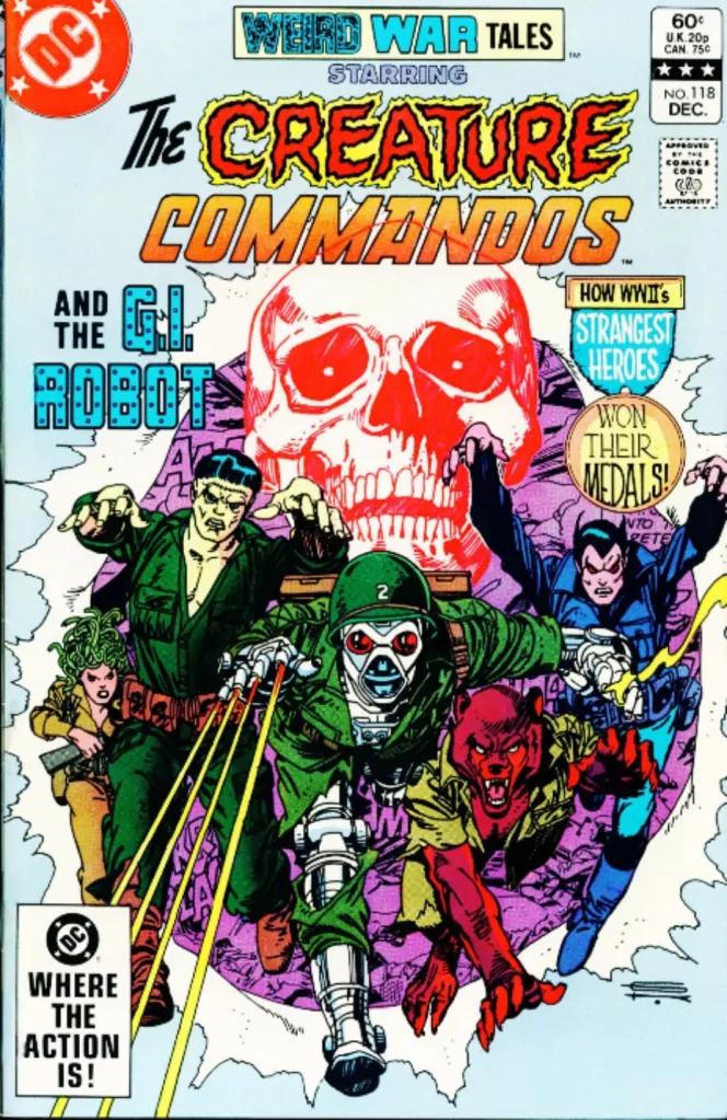1982’s Weird War Tales #111 was the first time the Creature Commandos — Lt. Shrieve, the vampiric Velcro, the mute monster Taylor, the werewolf Griffith, and the snake-haired Dr. Medusa — joined forces with the G.I. Robot, a.k.a. J.A.K.E. (Jungle Automatic Killer Experimental), successor of the G.I. Robot “Joe” from DC’s Star-Spangled War Stories.