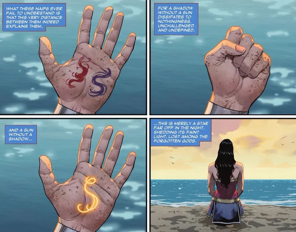 We then see Wonder Woman holding those two threads in the palm of her hand, and she then closes her fist and holds them tightly. When she opens her hand, a singular golden thread appears, and that leads us to a beautiful scene that echoes Wonder Woman’s original origin.