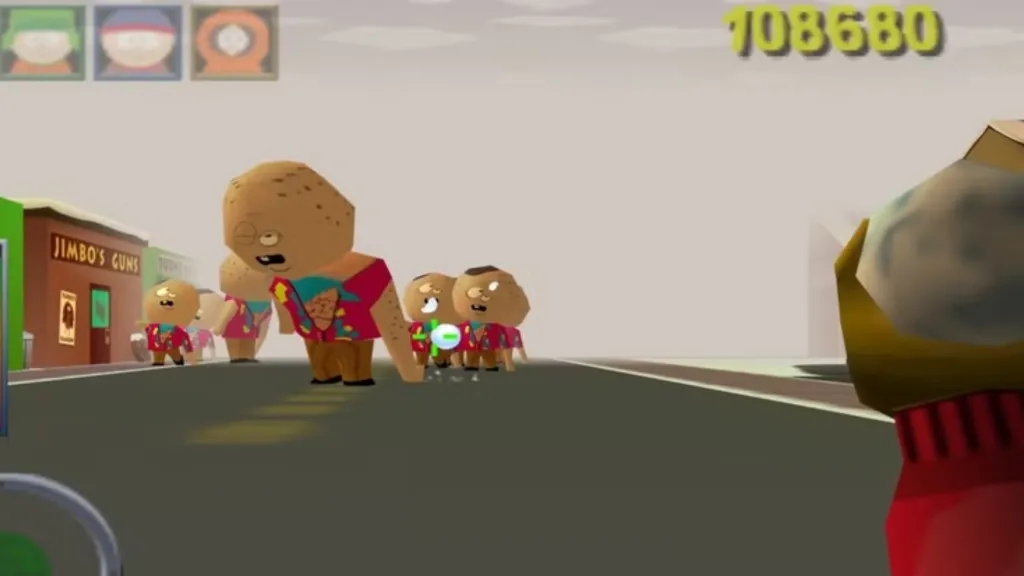 The first of these titles was simply titled South Park, a first-person shooter that cast players as one of the four central characters (Stan, Kyle, Cartman, and Kenny) using a variety of weapons from around town to save the day after a mysterious comet sets off a series of strange events in South Park. Designed with a tweaked version of the Turok 2: Seeds of Evil game engine, South Park was launched on the Nintendo 64 on December 21, 1998. It had tanky controls, and the presentation was limited by lackluster graphics.