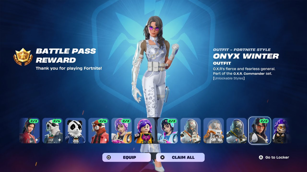 The Onyx Winter skin found its way into Fortniteโs Chapter 6, Season 4 Battle Pass. The Epic skin is part of the O.X.R. Commander Set and comes with three styles, with glasses either on or off. Additionally, there are three Super Level versions of the characterโs skin available. Since her introduction, Onyx Winter has been used by over 3.3 million players, taking a slight lead over Clix. The numbers are impressive, seeing as Onyx Winter was made available on August 7, 2025, which was six months after Clix. Once unlocked, players could equip Onyx Winter for 1,000 V-Bucks.