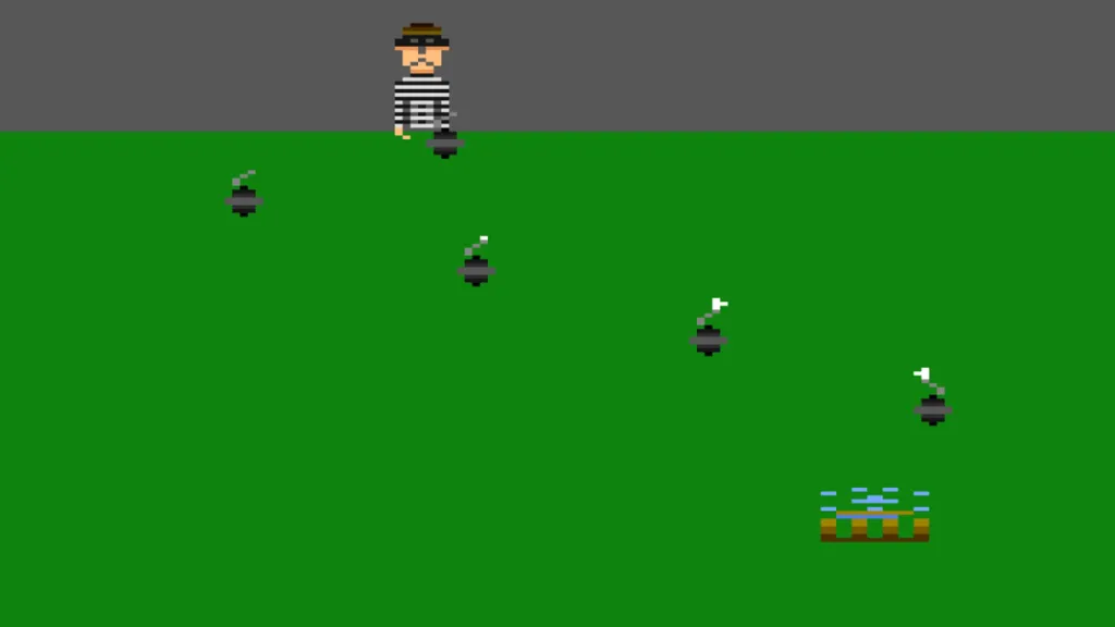Kaboom is a simple game. There’s a mad bomber dropping lit explosives off a ledge. You have a water bucket and need to catch the bombs before they hit the ground and explode. Again, there’s not much depth to Kaboom, so you can probably guess why it starts to get difficult as you progress.