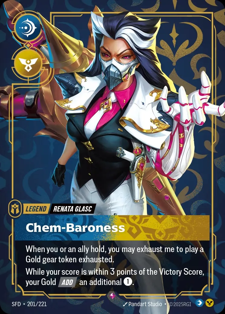 Some of my favorites include Chem-Baroness, who not only features an awesome design but also has an ability that allows you to exhaust her and play a Gold gear token. Then, when your score is within 3 points of Victory (which is 8), your Gold can add an additional 1 energy. Then there’s Emperor of the Sands, who brings together the various Sand Soldier-related cards and gives them weapon master. Plus, you can exhaust him and pay an energy to playa 2 Might Sand Soldier Unit Token to your base, though you have to have planned an Equipment this turn.