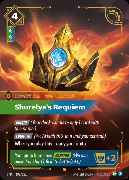 There’s also Signature Gear for specific Legends, and those can be even more powerful. Shurelya’s Requiem, for example, not only readies your units when played, but it then gives units here Ganking (allowing it to move from battlefield to battlefield) and +2 might. Equipment adds a whole new layer of strategy, and that will only increase as more equipment is introduced.