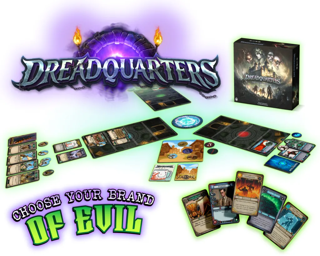 Who hasn’t wanted to build an evil villain lair after watching too many episodes of Super Friends, right? Okay, that might just be me, but now that’s fully possible in a board game. In Dreadquarters, you will attempt to cooperate with your fellow villains to set up your lair and expand it with all sorts of bizarre rooms, and then you’ll reinforce them with upgrades and defenses. You’ll also deploy your minions to work stations, city raids, or last stands.