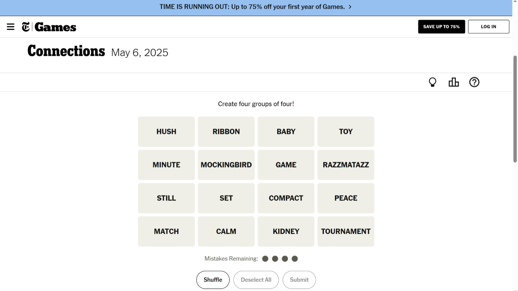 With todayโs Connections, we continue the easy streak weโve had with yesterday and the day before, but donโt let that trip you up, like some of these words will. For puzzles like todayโs, keep in mind that many words can have multiple meanings, so pay attention to them as you see any matches and try not to look for the obvious unless it only has one meaning. In terms of May 6thโs puzzle, the words in todayโs Connections are as follows: Hush, Ribbon, Baby, Toy, Minute, Mockingbird, Game, Razzmatazz, Still, Set, Compact, Peace, Match, Calm, Kidney, and Tournament.
