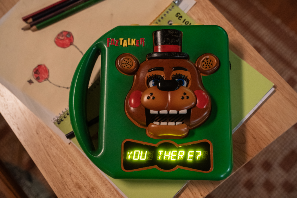 Given Lillard looks to be totally okay in this image, it’s safe to assume this is likely a flashback prior to the events of the first Five Nights at Freddy’s. It’s unclear exactly how much he will be in the film or if he will find a way to come back from his fatal injuries, but at the very least, fans can expect more Afton. On top of that, there’s another Five Nights at Freddy’s 2 image of a toy called “Faztalker” which looks like it lets users talk into it and then the device speaks back through a text box. The text on the toy reads “You there?” This fuels speculation that Five Nights at Freddy’s 2 will feature the toy versions of the animatronics.