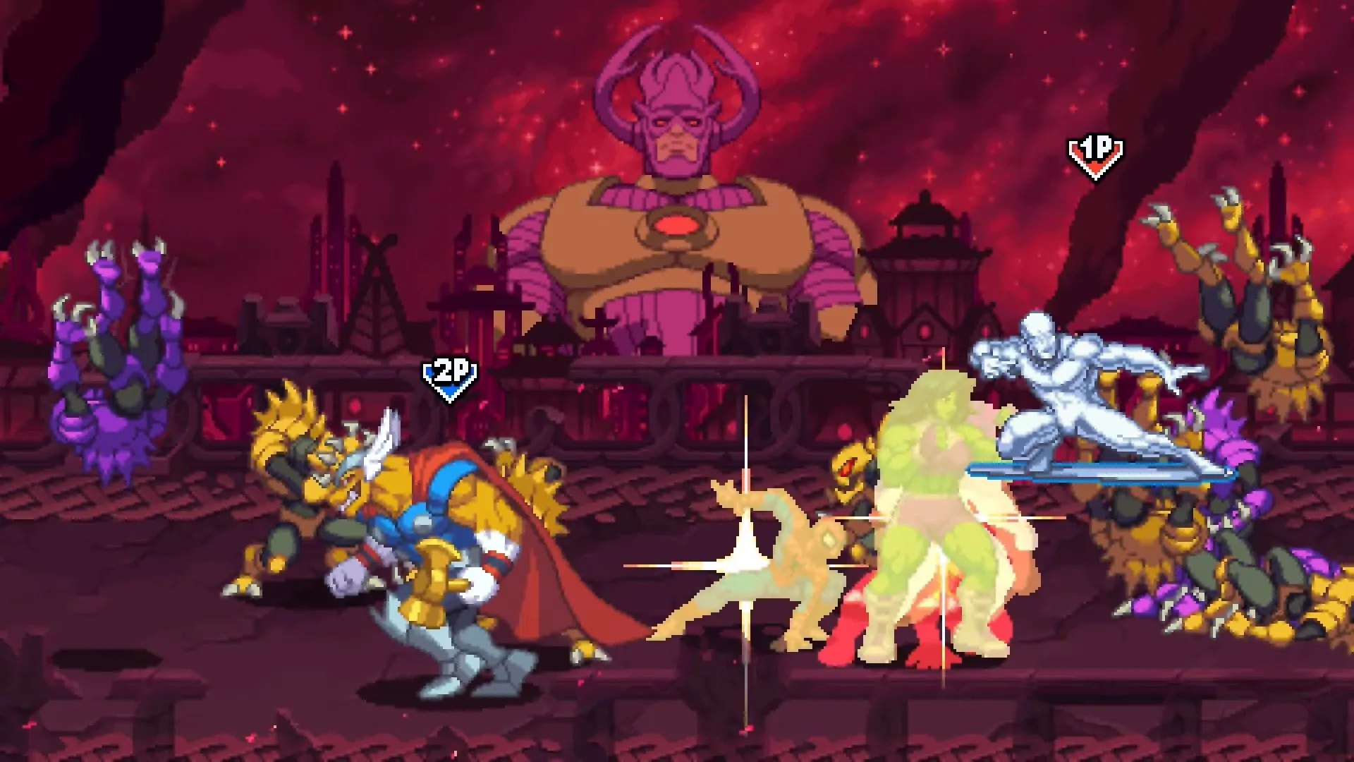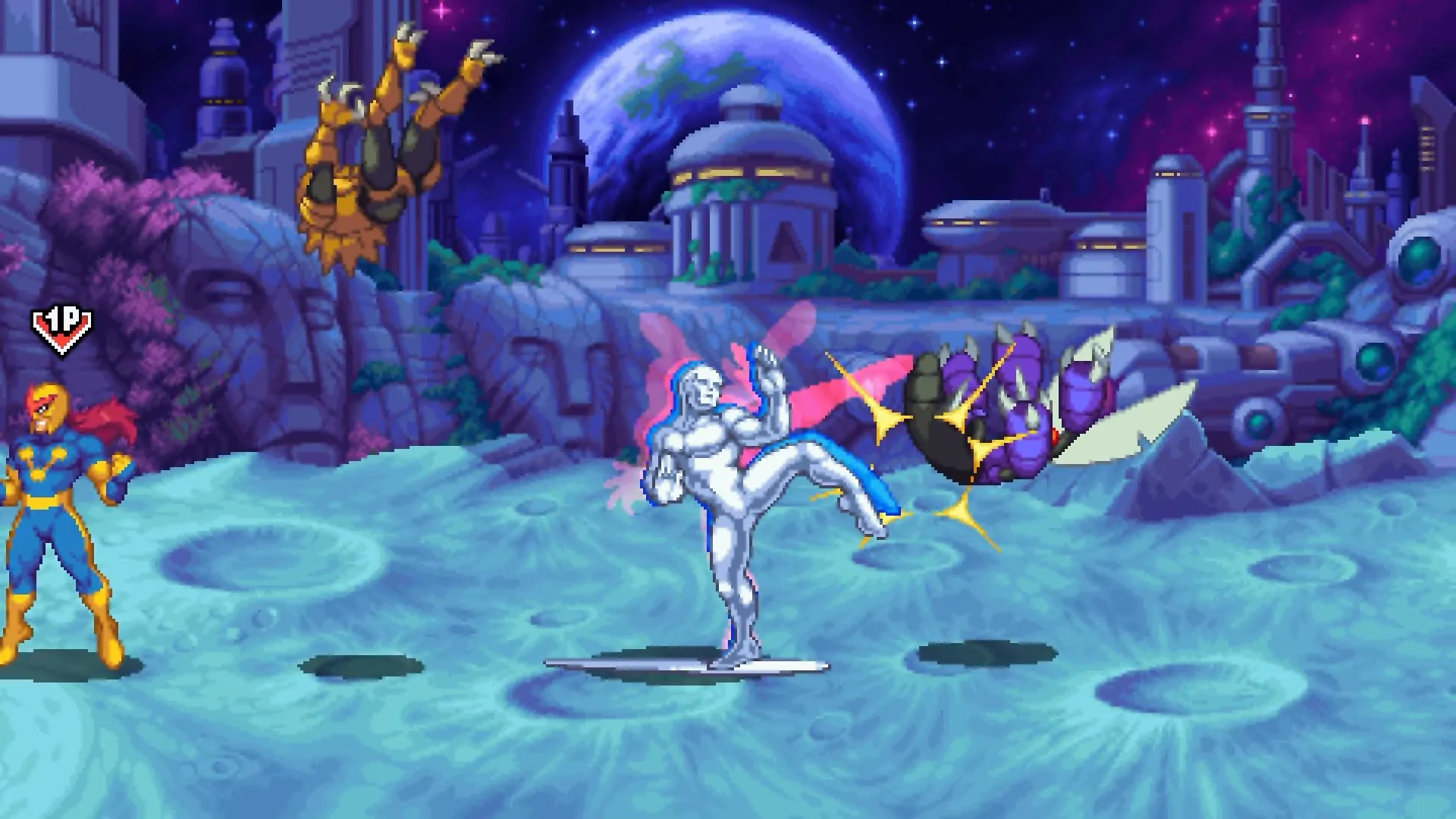 Now, Silver Surfer is no pushover in melee combat either, as Surfer looks to have several deadly offensive combos when things get dicey up close. Surfer has even more options though when it comes to movement, as he can use his surfboard to dash across the screen and get into range of just about anyone. He’s also able to send his board a short distance to knock enemies back, and he can stay out of range by hovering on his board in the air. If he becomes surrounded, Surfer can unleash the Cosmic Shockwave, damaging enemies all around him and sending them flying back.