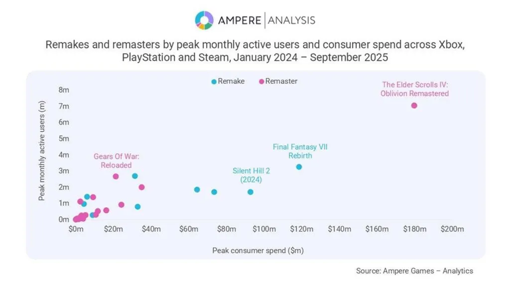 Out of the 42 titles it looked at, average global spending on the average remake was 2.2 times that of the average remaster. Ampere provided a graph that showed peak monthly active users on the y-axis and peak consumer spending on the x-axis. This graph specifically highlights Final Fantasy VII Rebirth and Silent Hill 2 as remakes that raked in money and also had decently sized player bases, while Gears of War: Reloaded gained less money but received a comparable amount of peak monthly active users. The Elder Scrolls IV: Oblivion Remastered is a massive outlier on both axes since it had the highest amount of peak monthly users (around 7 million) and the most money spent on it (about $180 million).