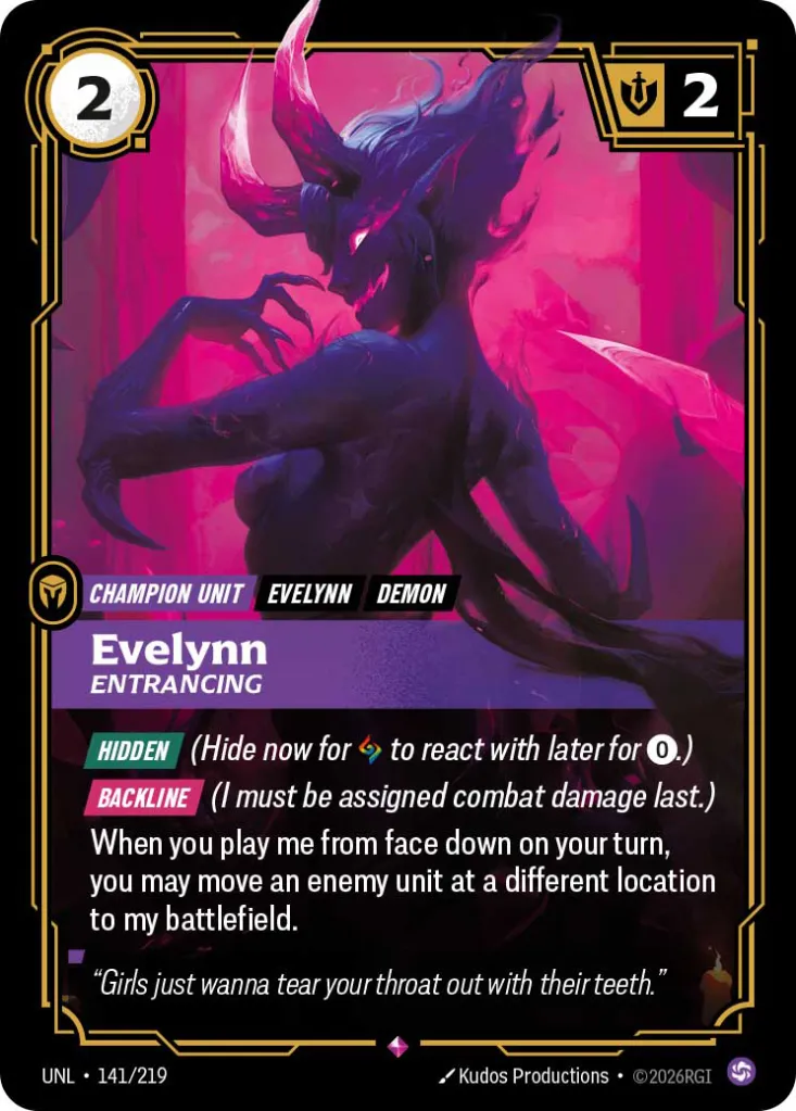 Today, ComicBook can exclusively reveal a new addition to Riftbound: Unleashed in the form of the Champion Unit and demonic force of nature known as Evelynn. The Evelynn Entrancing Champion Unit is a member of the Chaos (Purple) Domain, and is a 2 Cost and 2 Might card. The first thing you’ll notice is the stunning artwork, but the card is also going to be quite useful in combat when you utilize it as part of a reaction, helping you shift battles in your favor on two different fronts.