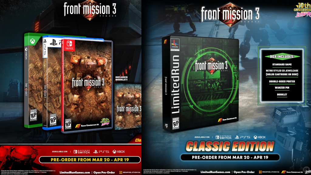 That said, those in 1999 or 2000 who played Square’s tactical role-playing game, Front Mission 3, will be excited to know it is getting a special release. This PS1 exclusive returned earlier this year via a remake, aptly titled Front Mission 3: Remake, which was not handled by Square Enix. Rather, Square Enix licensed out the game to publisher Forever Entertainment and developer MegaPixel Studio. This remake was released on January 30 via Nintendo Switch, PC, PS4, PS5, Xbox One, and Xbox Series X, but only digitally. Now, it is getting a limited retail release for those who prefer physical copies of games, as well as for collectors.
