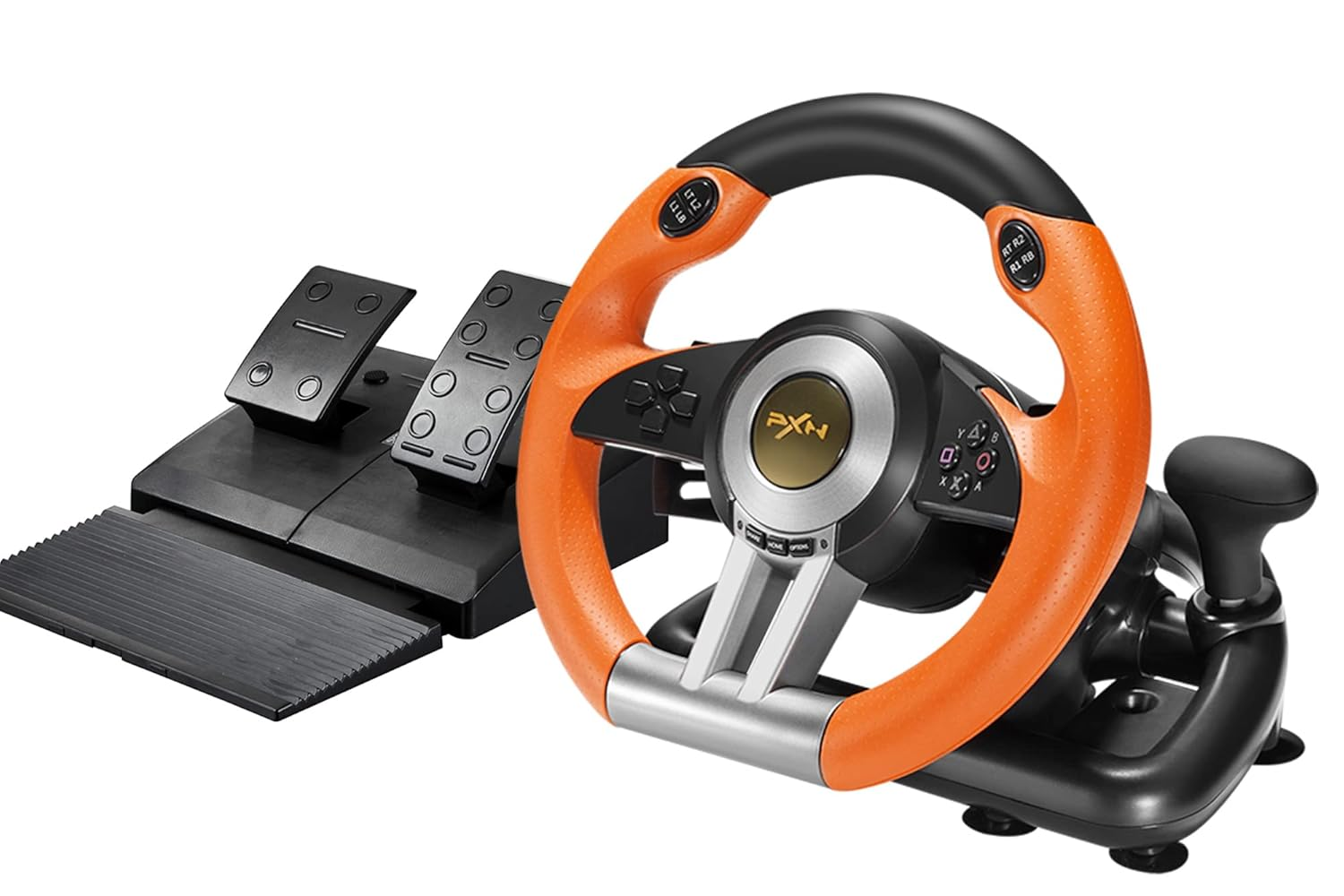 If you’ve never owned a racing wheel before, the PXN V3 PRO is a great starting point. Priced under $100, it offers 180-degree rotation, dual vibration motors, linear pedals, and paddle shifters, all wrapped in a package that works across PC, Xbox, PlayStation, and Nintendo Switch. It’s not a force feedback wheel in the true sense, but that’s not really the point here.