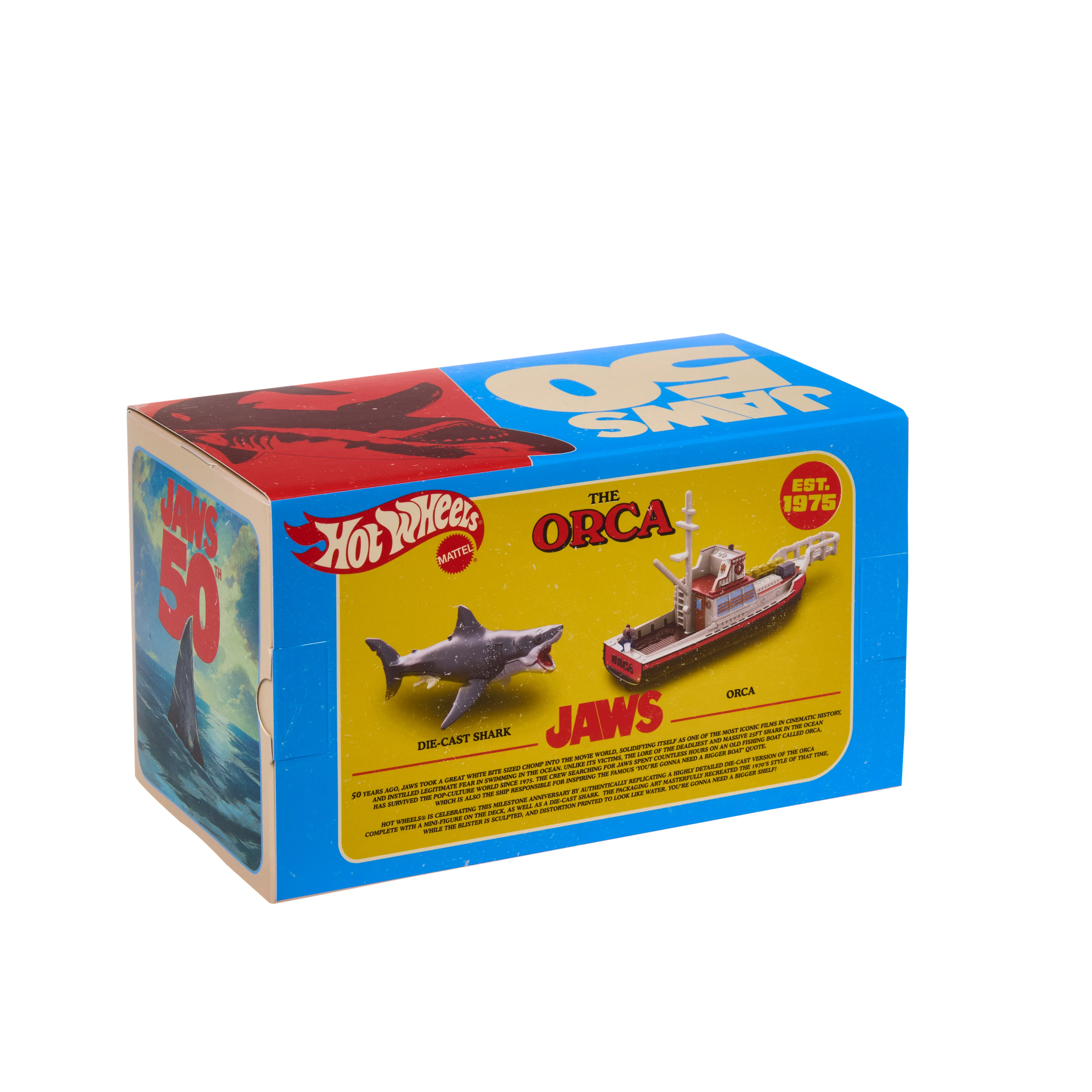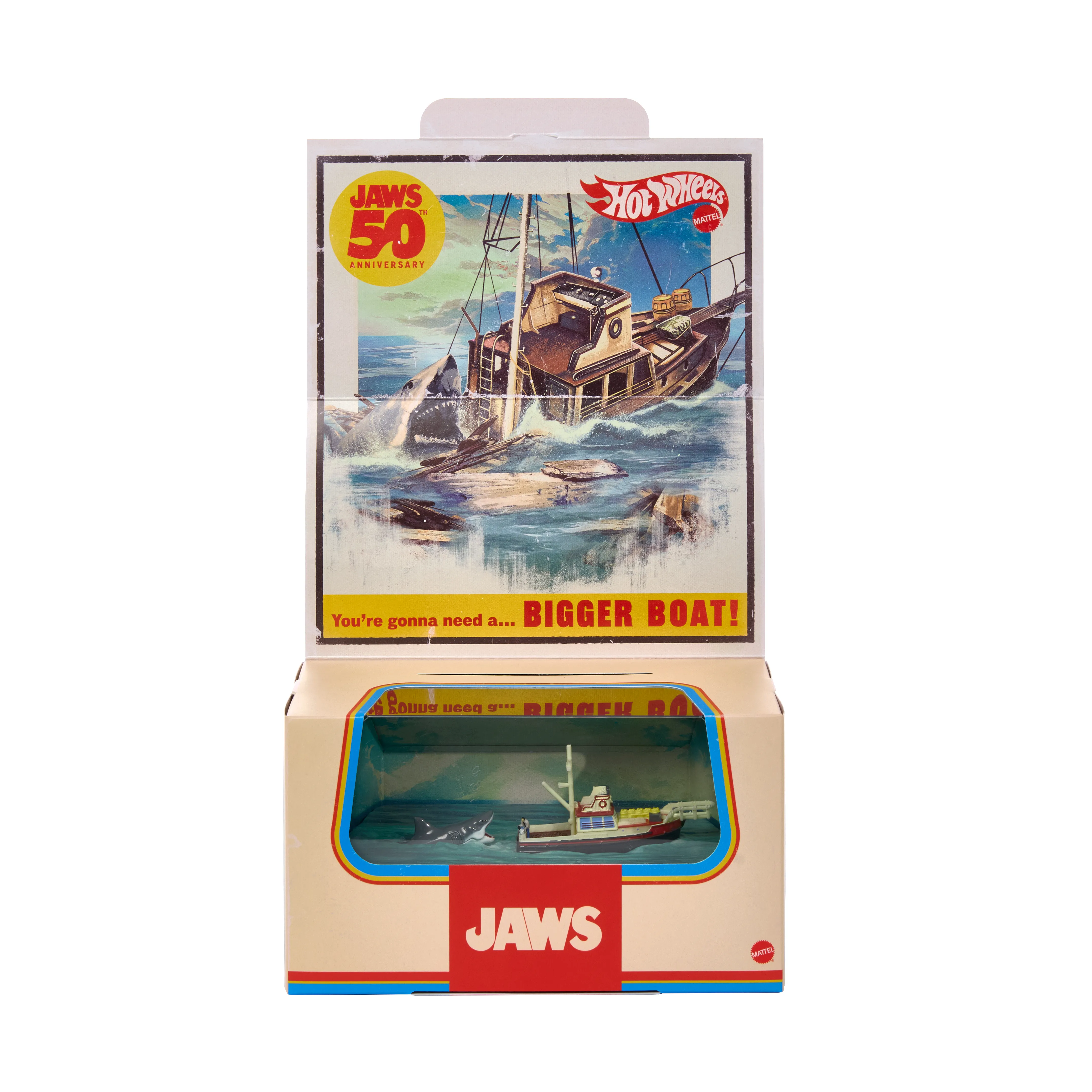 Mattel has another celebrated franchise in the mix as well, as in celebration of Jaws’ 50th anniversary, there will be a Hot Wheels collectible set that comes complete with fully vintage packaging. As you can see in the photos, the set will recreate one of the film’s most memorable scenes, and what’s even better is that both the shark and the boat are separate die-cast pieces.