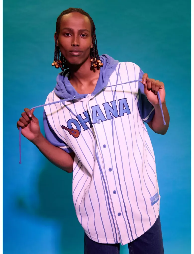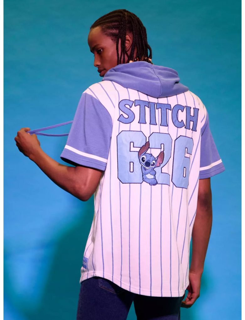- Our Universe Disney Lilo & Stitch Ohana Hooded Baseball Jersey – $54.90 / See here at Hot Topic