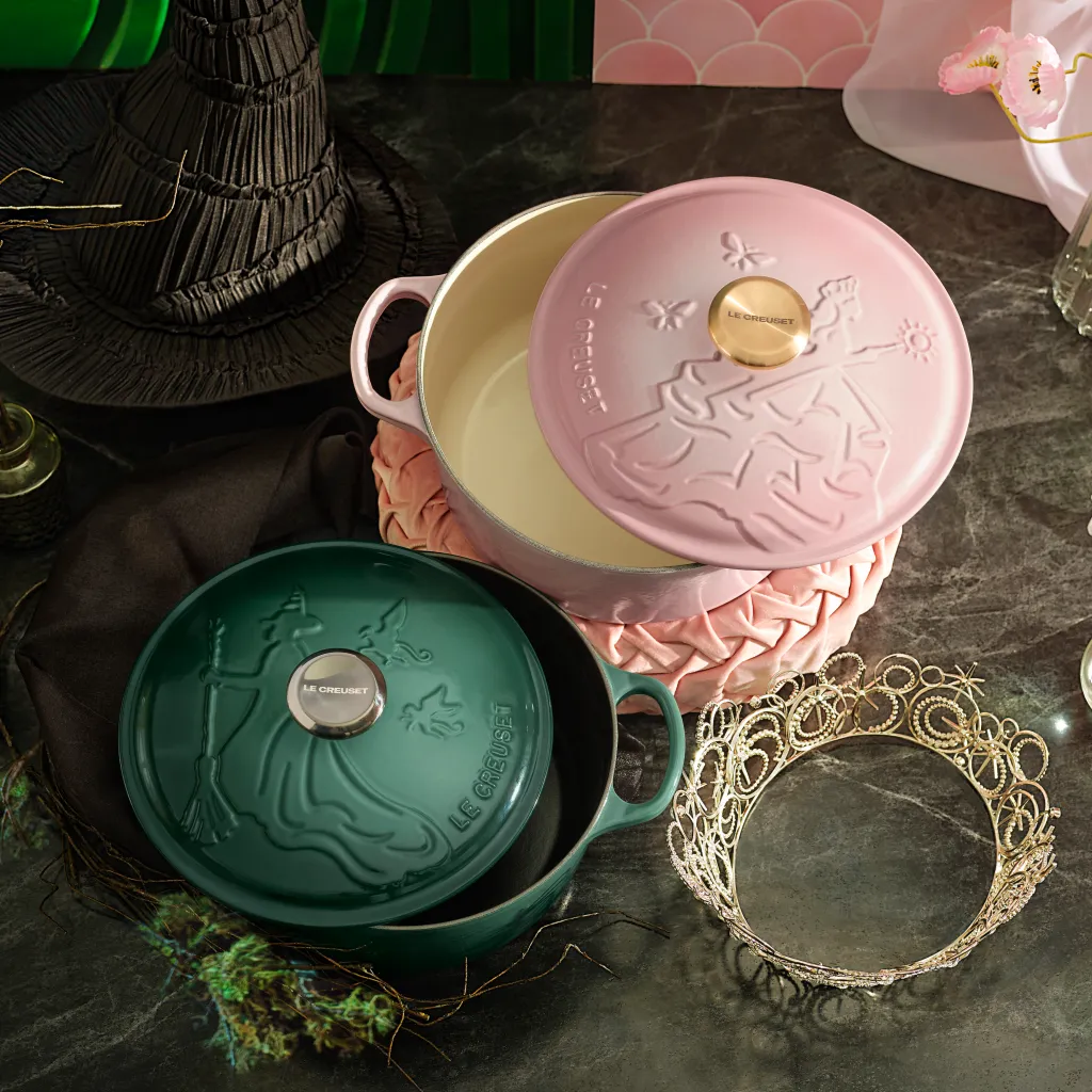Elphaba’s dutch oven features her silhouette embossed on the lid in dark green color with a matte black interior, perfect for the protagonists’ new persona in the concluding film. Meanwhile, you’ll find Glinda’s Dutch oven in a soft pink, her silhouette also on the lid of the oven.The interior has a white matte finish. Both are quite beautiful – for pots.