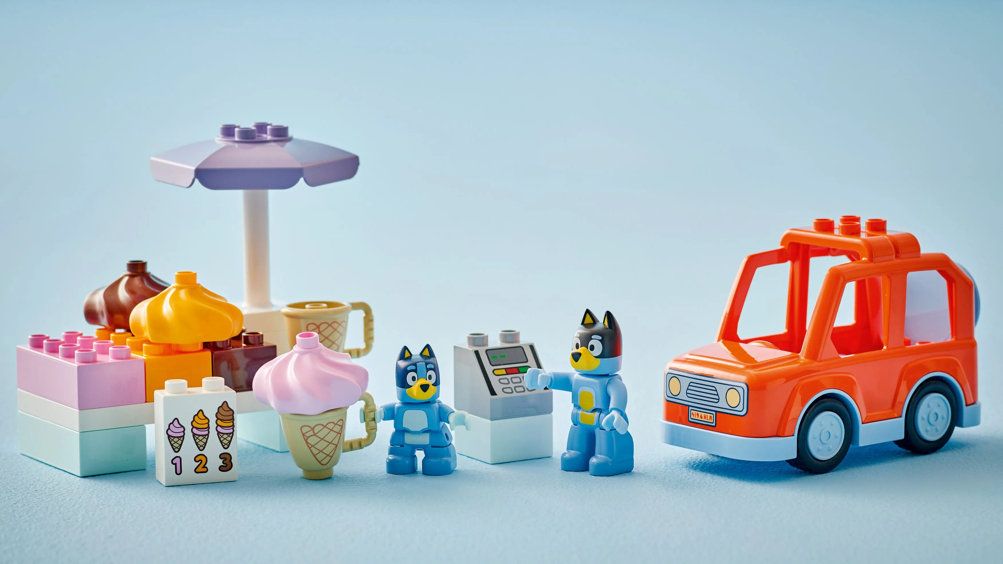 LEGO DUPLO Bluey Ice Cream Trip with Bluey (10458) / $29.99: “Jump in the Heeler family car and join Bluey and Dad on a trip to buy ice cream. Preschoolers develop color-sorting skills and learn to recognize numbers as they match scoop colors with the flavors at the ice cream stand. Just like in the Bluey TV episode, they get a choice of mango, strawberry or chocolate. Or, if Dadโs being generous, they can have all 3!”