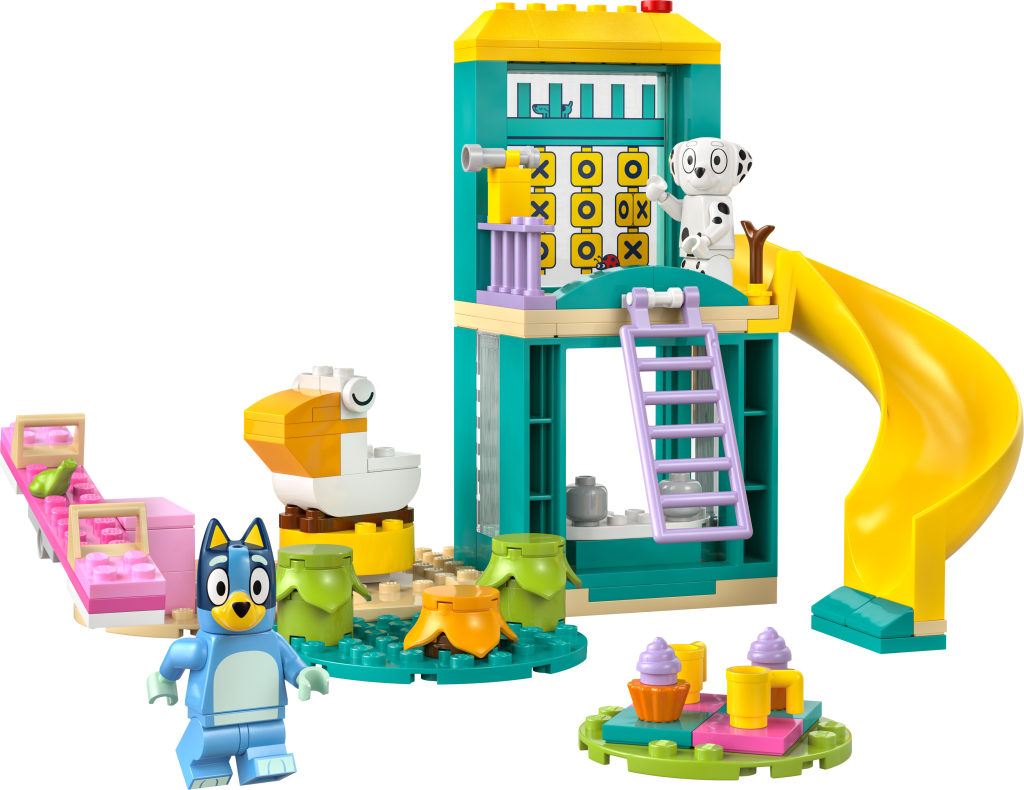 LEGO Bluey Playground Fun with Bluey and Chloe (11201) / $19.99: “Join Bluey and Chloe at the playground. Bluey climbs the ladder to the top of the tower, looks through the telescope, then whooshes down the slide. Chloe jumps from plant to plant, then races to join Bluey on the seesaw. Next, the friends take turns sitting on the revolving pelican. Hold on tight! Then itโs time for drinks and cupcakes (yum!), before getting back to the playground fun.”