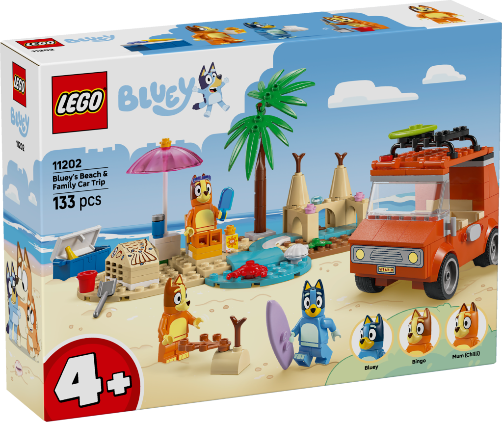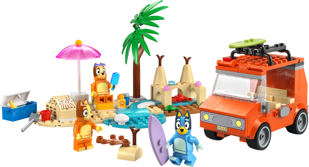 LEGO Bluey: Blueyโs Beach & Family Car Trip (11202) / $29.99: “Pack the car for a fun day at the beach with Bluey, Bingo and Mum! Choose a nice spot under the palm tree, splash on the sunscreen, then itโs time to play! Bluey buries her legs in sand to make a mermaid tail and Bingo builds a sandcastle (itโs so good, a crab makes it its home!) while Chilli, Blueyโs mum, relaxes under the parasol. Grab an ice cream from the cooler, thenโฆ whoโs ready for surfing?”