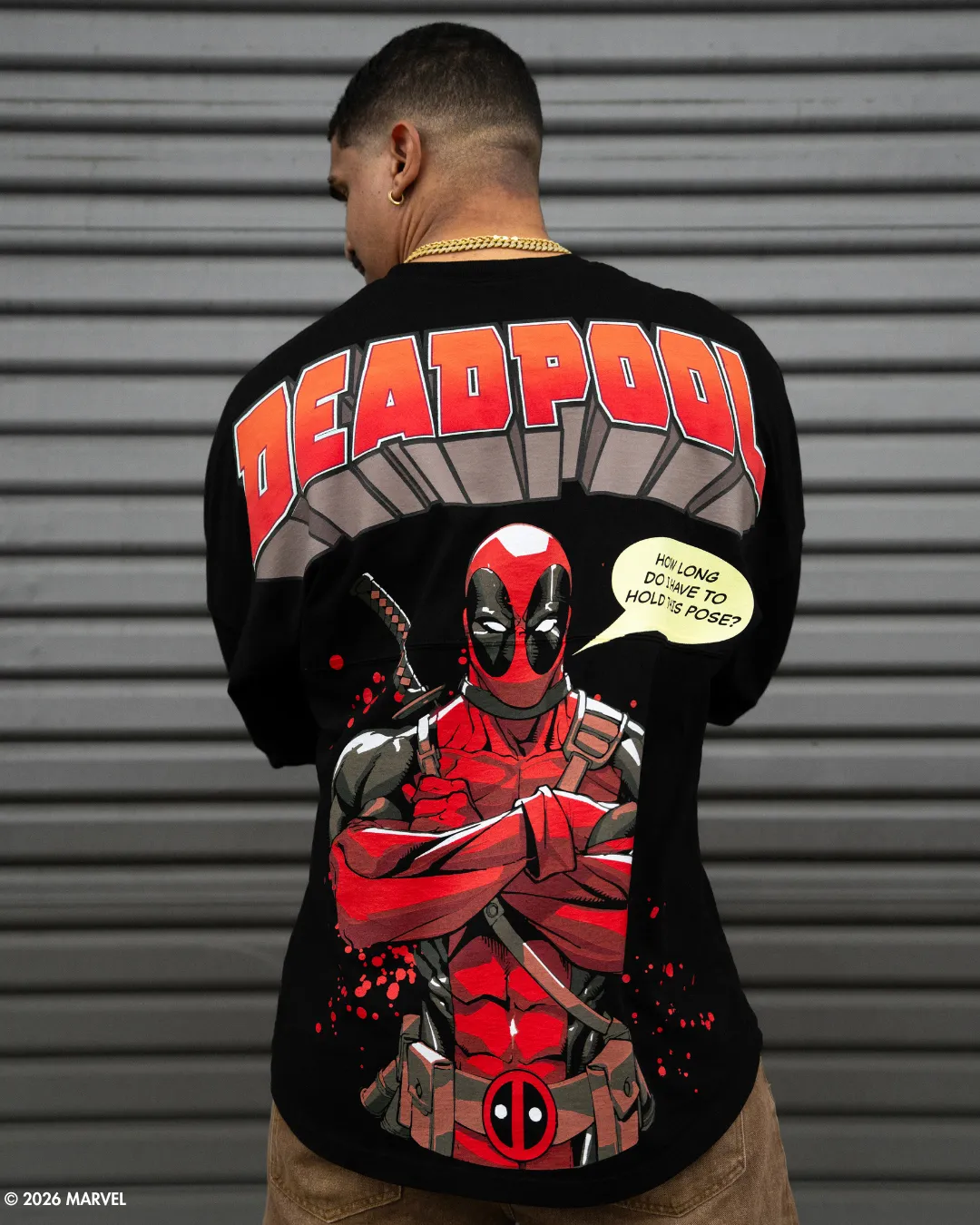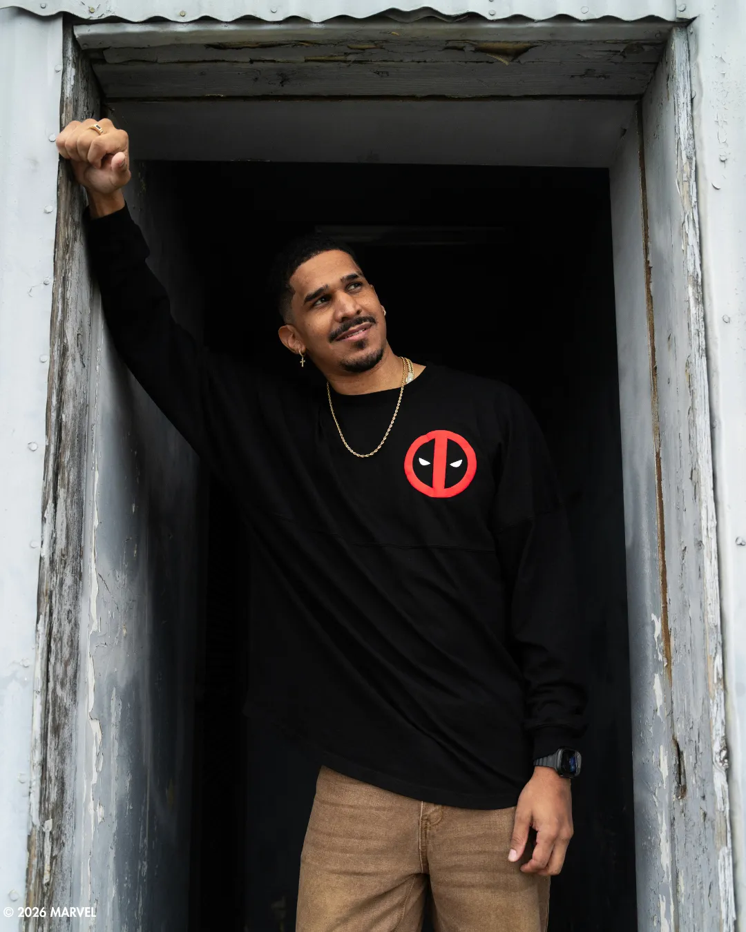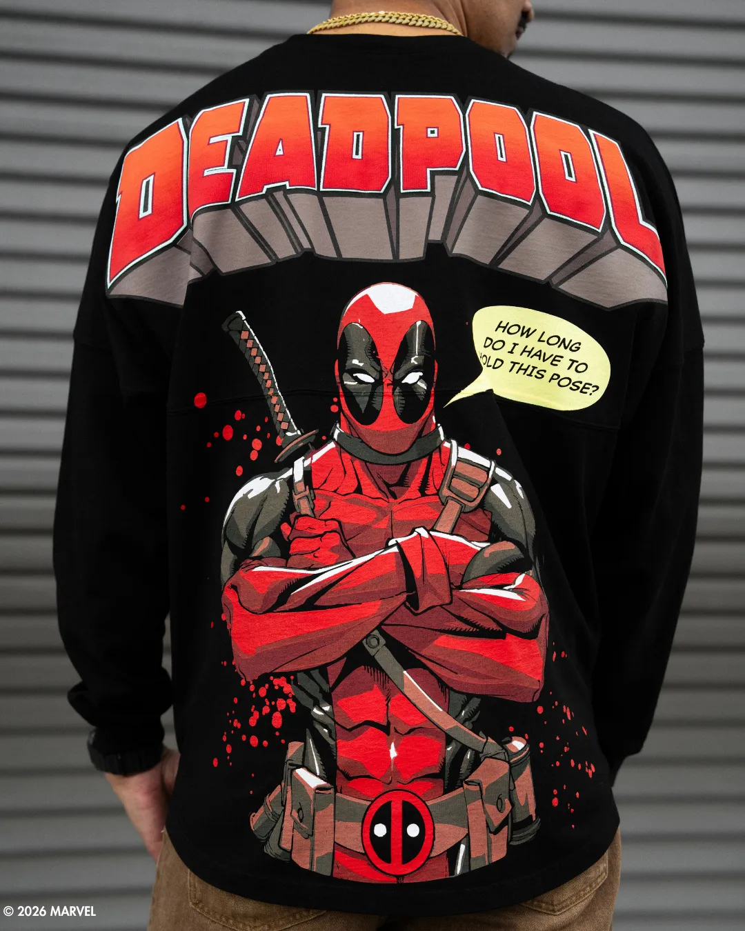 The final shirt is probably my favorite, and it’s the Marvel Deadpool Classic Spirit Jersey. This is a long-sleeve shirt that features the Deadpool mask logo on the front, but also features full artwork on the back that includes the Deadpool logo and Deadpool himself asking, “How long do I have to hold this pose?. The Deadpool Classic Spirit Jersey retails for $90.00.