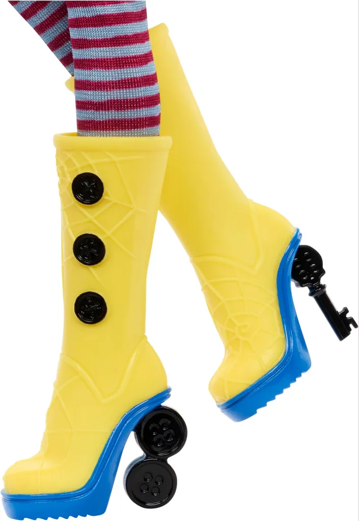 The two teams behind the collab have done a fantastic job combining the two aesthetics of Monster High and Coraline. The doll includes Coraline’s iconic blue bob hairdo and the iconic yellow raincoat from the film, two incredibly important pieces that made Coraline stand out and her character design so memorable. On top of those, her outfit also includes the red dress, striped socks, yellow rainboots, and newsboy cap with the gold accents.