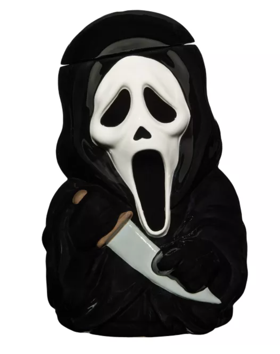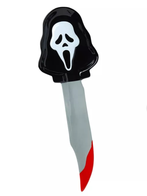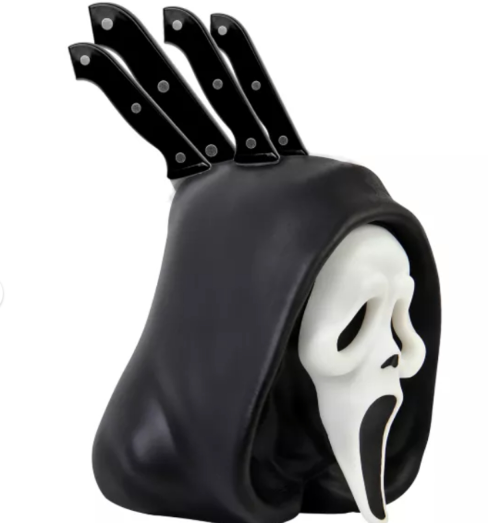 Clearly, the best item in the Scream collection is a Ghostface knife block that you can stab with up to 4 knives. That would be followed by the Ghosface cookie jar which is out of stock at Spirit Halloween but can be ordered here at Spencer’s. Third on the list would be the Ghostface utensil holder shaped like his bloody knife. Rounding out the list is the Ghostface chip & dip set littered with little ghostfaces and knives and a bloody rim, and the Ghostface cutting board. All items are priced between $16.99 – $34.99. Now that you’ve had the main course, let’s talk about dessert with my Scream movie ranking below.