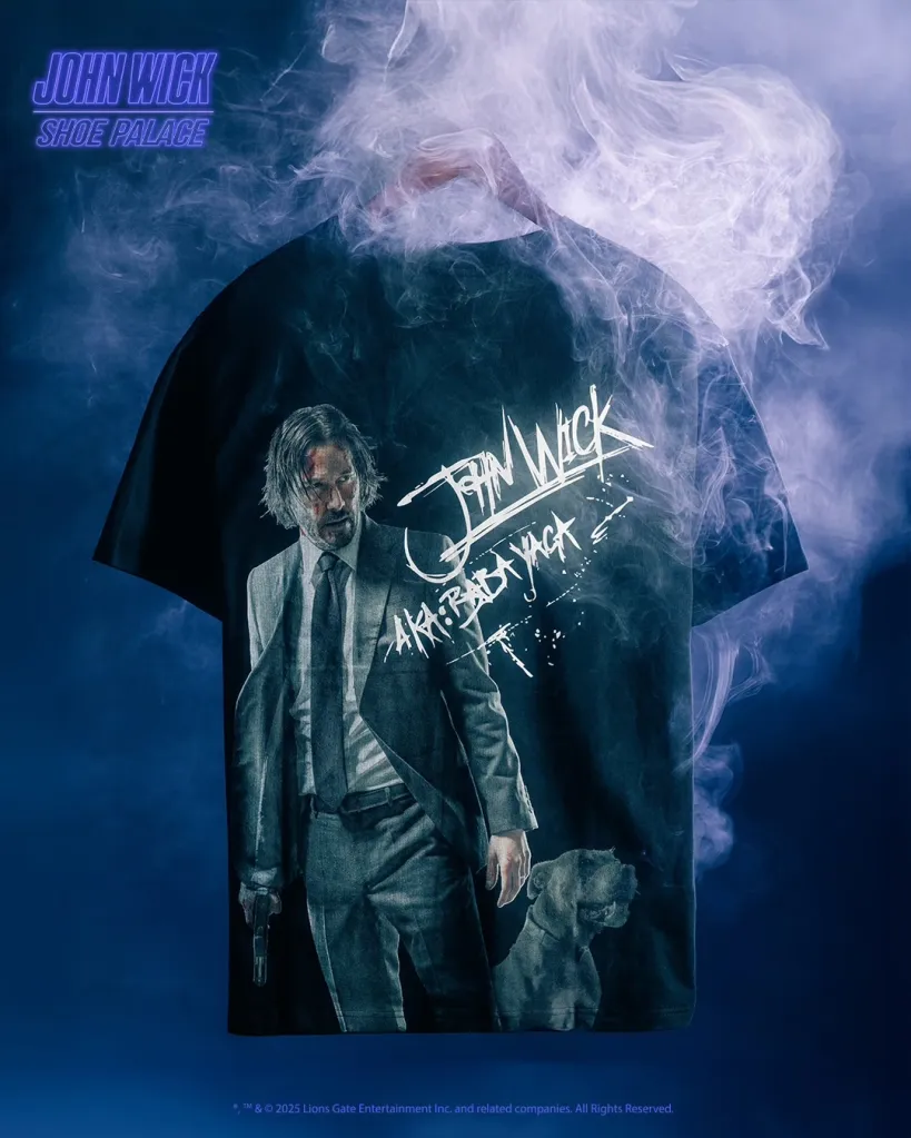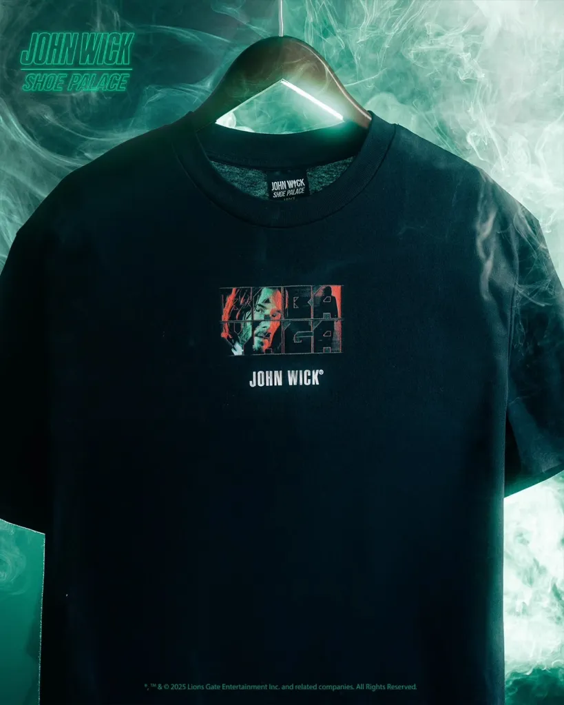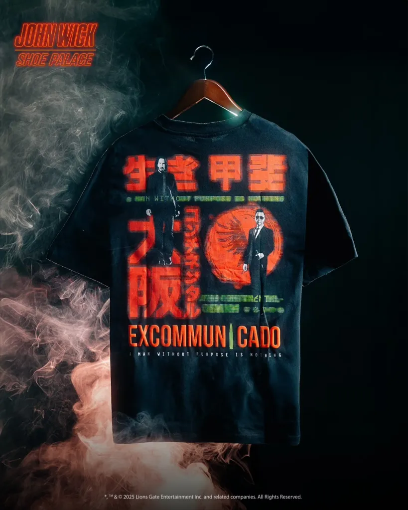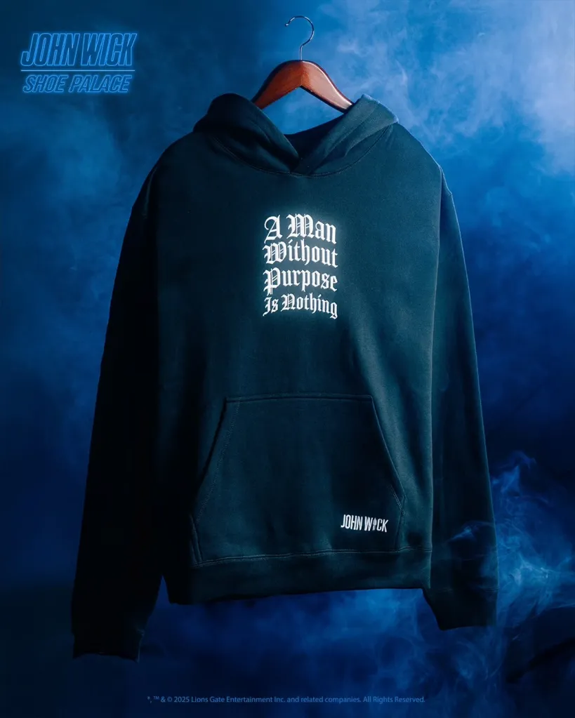 The John Wick Shoe Palace collection features a number of slick t-shirts and hoodies, starting with the SP X John Wick No Business shirt, which features a clean design on the front and a large shot of Wick and his reliable Pit bull. Wick and his friend are also featured on the back of the SP X John Wick Purpose Pullover, which also features the “A Man Without Purpose Is Nothing” quote on the front.