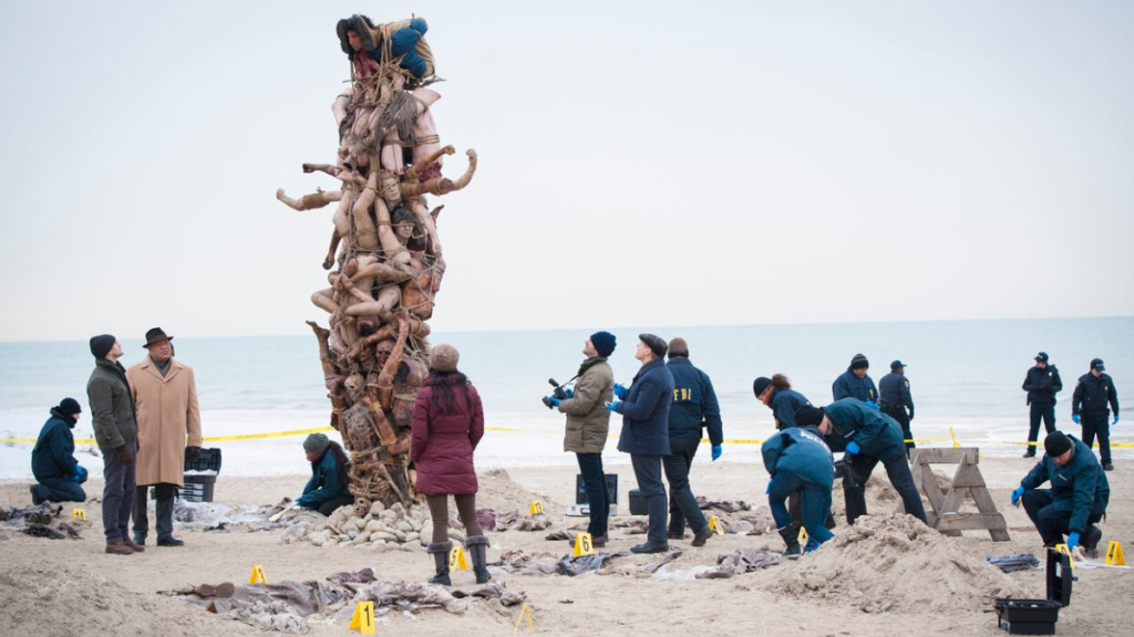 The totem pole of bodies on the beach is a striking image from Hannibal, like the world’s grossest jigsaw puzzle. As Jack’s team attempts to piece together clues from the victims that have been collected over time, the symptoms of Will’s encephalitis cause him to lose bigger gaps in time and experience severe hallucinations.
