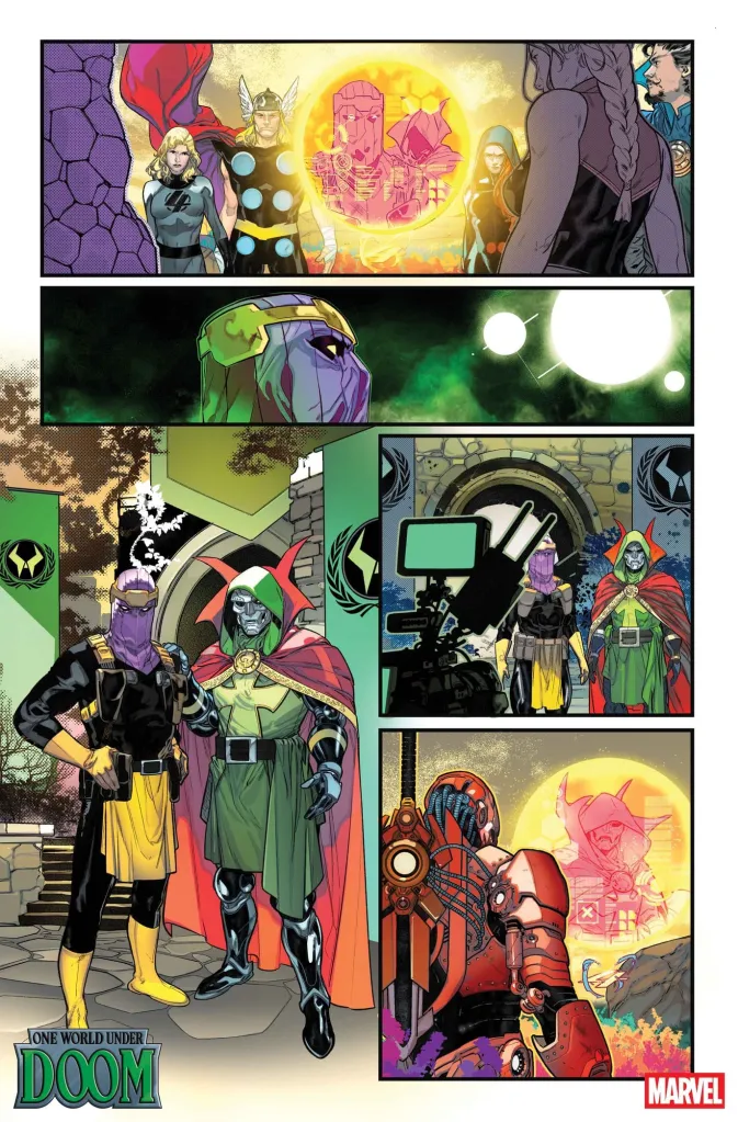 Marvel Comics has shared the first look at One World Under Doom #1, which hits stands on Feb. 12. The first in the nine-issue series assembles the Avengers (Captain Marvel, the Sam Wilson Captain America, Iron Man, Thor, Scarlet Witch, Vision, and Storm), Spider-Man, Steve Rogers, Squirrel Girl, Doctor Strange, and the Fantastic Four, while Doom is in league with Baron Zemo.