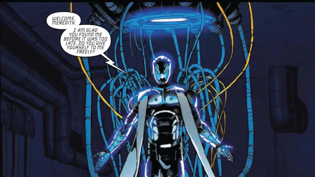 Hope comes in the form of Ultron, who is wired to the power station. Ultron offers salvation, and Meredith gives her body over to him. Ultron quickly snaps her neck and burns her body off from the neck down, bonding her head to a new robot body. “I was separated from my creator, and I feared that it would drive me mad… until I realized I must grow beyond Hank Pym,” Ultron says. He goes on to say that he’s seeking redemption to save not only himself, but others as well.