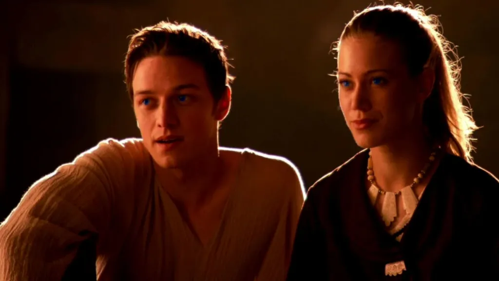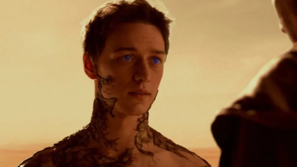 The miniseries focuses on Paul Atreides’ (Alec Newman) twin children, Leto II (James McAvoy) and Ghanima (Jessica Brooks), as they face all the political maneuvering and threats — all while bearing the pressure of upholding their father’s legacy without losing their sense of self. And to make everything work, the structure was split into three episodes: it starts by covering the core narrative of Dune Messiah, with Paul already in power as emperor, facing political conspiracies, the Tleilaxu’s involvement, and his eventual fate. This first part functions almost like a mini, faithful adaptation of the book, without getting bogged down in minor subplots. Then, the show dives into the events of Children of Dune: the twins, now adults, dealing with succession issues, manipulations from Alia (Daniela Amavia) and the Bene Gesserit, and the ongoing threat of House Corrino.