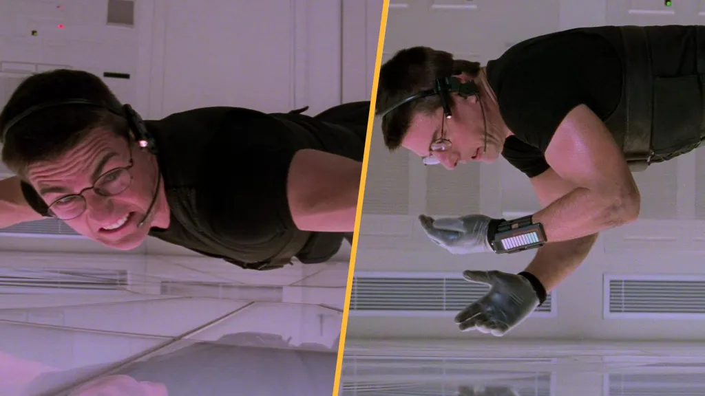 To make matters worse, a single bead of sweat begins to make its way down Ethan’s glasses and accumulates on the lens until it’s ready to fall. Naturally, Ethan is ready and swoops his left hand underneath the drop, catching it and preventing the alarm from going off. It’s a great scene, and one of the most iconic moments in the series that doesn’t involve an explosion, but when we compare the two shots, there should be no way that Ethan had room to catch that drop. Sorry to ruin it for you.