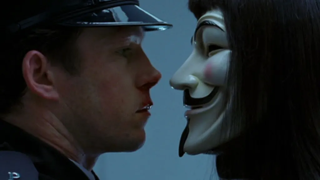 Then there’s the clever obsession with the number five (or “V,” in Roman numerals). It’s everywhere: V lives in Room V, the revolution happens on November 5th, the dominoes fall to form a massive “V,” and there are five major explosions throughout the movie. Even the soundtrack, graffiti, and set pieces quietly echo the same motif. It’s a subtle, mathematical layer of symmetry that ties everything together without ever calling attention to itself. V for Vendetta might look like a political thriller on the surface, adapted from a comic book, but it’s built like a puzzle.