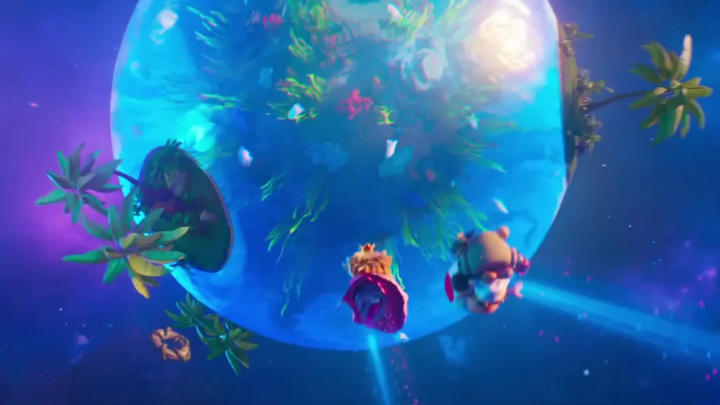 As Peach and Toad make their way to the Gateway Galaxy in the film, they pass by a slew of different plants from both of the Galaxy games. Among them are Drip Drop Galaxy with its vast waters and tiny islands, but also a Star Bunny planet, and the Gusty Garden Galaxy, both of which can be seen briefly on screen.