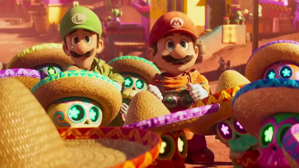 When we meet Mario and Luigi in the film, they arrive on the scene to address a complaint by the residents of Tostarena Town, who point them toward an Inverted Pyramid, from which a terrifying noise bellows out. All of this is lifted directly from the Sand Kingdom of Super Mario Odyssey, though the outfits that the two plumbers wear are more reminiscent of Mad Max than what the character wears in the level in the game.