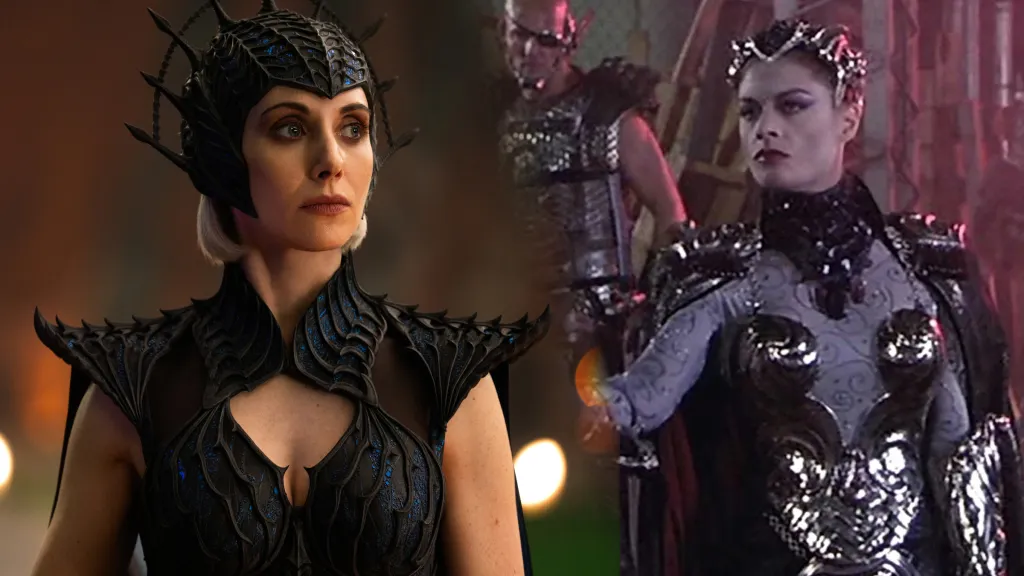 In the original 1987 film, the role of The Sorceress was played by Christina Pickles, and the costume was far more ornate and almost all white and silver. The headdress also changed things up and was covered in crystals, which was a big departure from the original costume that was white, blue, and orange and featured a wing-like cape.