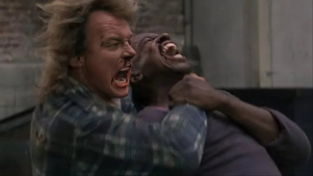 The sequence lasts a gargantuan five-and-a-half minutes, and the viewer feels every second of it. It’s both played for laughs and functions as a legitimately impressive, brutal fight (aided greatly by Piper’s history as a WWF and WCW wrestler). The scene has been parodied quite a bit, including in South Park, and rightly so, as it’s probably the best fight scene in film history.