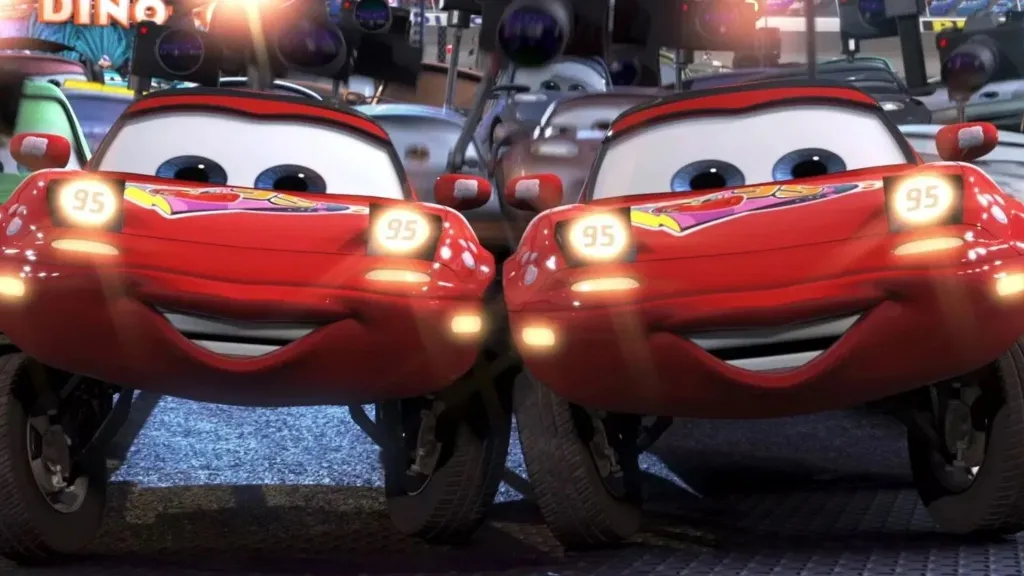 Following a decisive win, Lightning McQueen encounters a group of fans and paparazzi, among them are a set of twins who profess their admiration for him. They do this by “flashing” their headlights in unison, to which Lightning responds dreamily, “I love being me.”