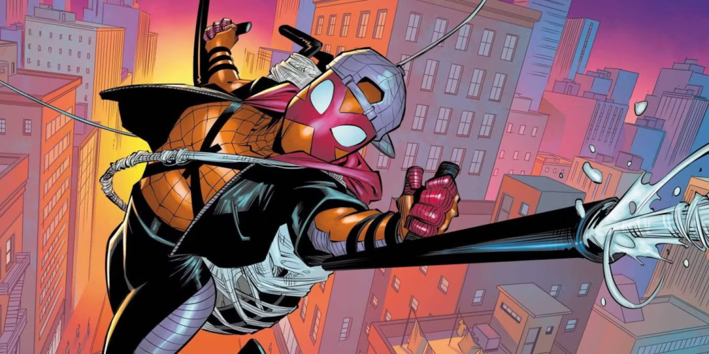 Charlotte Webber is a newer addition to the Spider-verse. Created by Dayn Broder, Charlotte/Sun-Spider debuted in 2020 in response to Marvel’s Spider-Verse series, an effort to showcase fan-created “Spidersonas.” Charlotte, or Charlie, has EDS (a genetic disorder that affects one’s connective tissues) and uses a wheelchair in her civilian life. When she’s bitten by a radioactive spider on Earth-20023, she gains superpowers and retains her condition. Sun-Spider’s E.D.S. doesn’t stop her from kicking butt, however. Charlie fights off bad guys with crutches that also serve as web-shooters, and in her brief appearance in Across the Spider-Verse, it appeared that Charlieย used a wheelchair that could transform into a Spider-like mech and carry her across the ceiling.