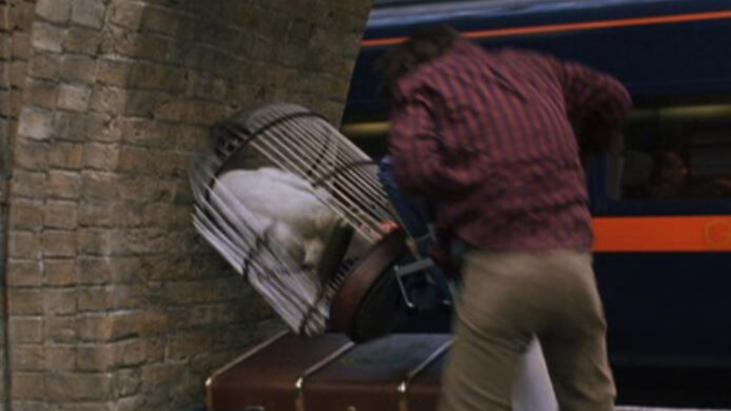 While we’re on the topic of Platform 9¾, a closer look at Hedwig’s cage during the moment of the trolley crash reveals something strange. As Harry slams into the solid brick wall, Hedwig’s cage falls to its side, and within it, you can see a very unconvincing plastic bird stuck into place. He doesn’t move, react, or flap his wings; the Hedwig imposter simply sits there stiffly, like a taxidermy hunting trophy. Mind you, this is long before the Basilisk starts petrifying people and animals.