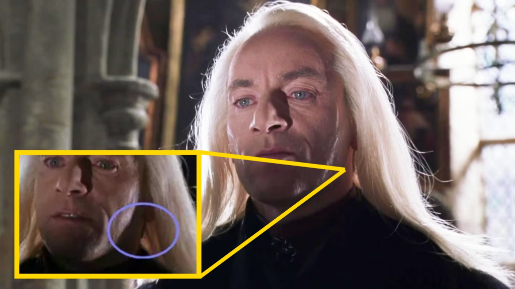 Jason Isaacs’ Lucius Malfoy might win for Best Dressed Evil Wizard, but sadly, his luscious blonde wig couldn’t withstand the lighting department. Near the end of the movie, as he storms into Dumbledore’s office with his signature sneer, you can clearly see a patch of short brown hair glowing, silhouetted by the backlights. His platinum locks are blown back behind his shoulders by the momentum of his angry marching just long enough to kill the illusion.