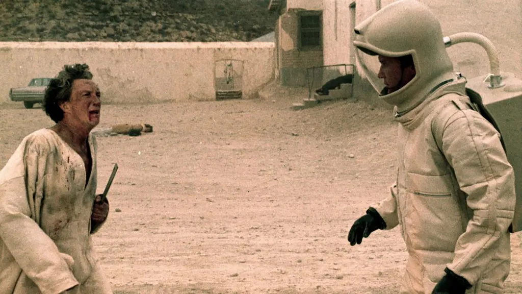 Robert Wiseโs The Andromeda Strain (1971) adapts Michael Crichton’s novel about a team of scientists studying an extraterrestrial microbe retrieved from a crashed satellite. The movie roots its realism in microbiology and real methods of containment and investigation, with the majority of its runtime spent inside the Wildfire laboratory underneath the Nevada desert. The cast, led by Arthur Hill and David Wayne, plays scientists tasked with analyzing the organismโs crystalline structure and conducting controlled variable experiments.