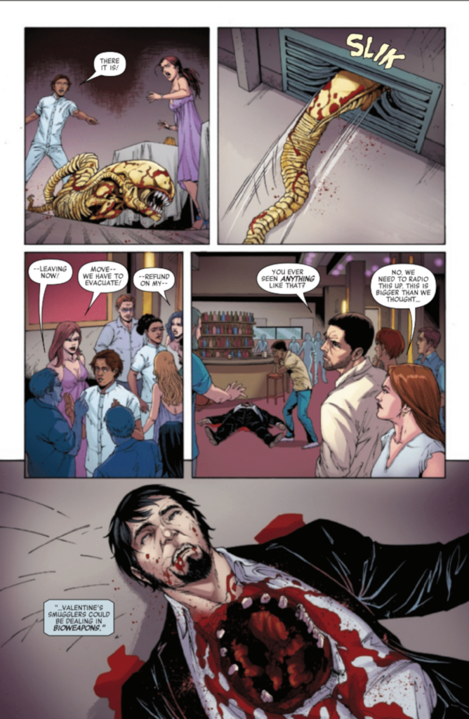 The story centers on Ricky Valentine, leader of a crew of arms dealers who comes to Paradiso to make a deal with a cartel that will give him unrivaled control of black market trade in the colonies. Unfortunately, poor gullible Rick doesn’t know that it is xenomorph embryos the cartel is bringing to Paradiso — incubating inside of live hosts. The deal is even more compromised by the fact that Colonial Marshals are onto it, and have two officers working undercover at Paradiso. None of that cops-and-robbers game matters, though, when the cartel contact arrives in the resort and promptly has a xenomorph burst out of his chest.