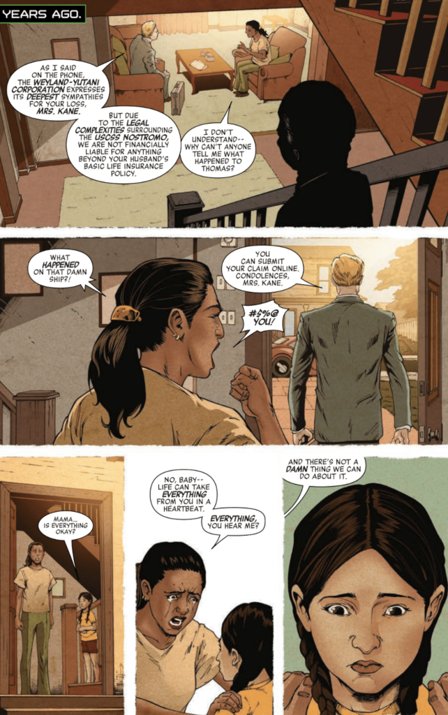 Alien: Paradiso #2 reveals that Tsula Kane is (as her name would imply) the daughter of Thomas Kane, who died aboard the Nostromo. The flashback scene focuses on Tsula’s memory of how a representative of the Weyland-Yutani corporation came to see her mom and explain that the nature of Thomas Kane’s death and the Nostromo’s destruction meant the company wouldn’t pay out anything beyond the basic life insurance policy. Mrs. Kane was broken by being left with no explanation about her husband’s death, and no finances to support her family, imparting the harsh lesson to Tsula that life is brutal, and we are powerless against that brutality.