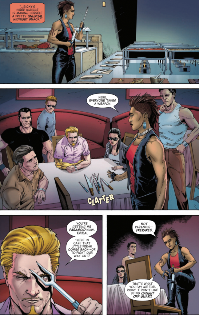 Alien: Paradiso #2 sees Ricky starting to realize just how badly his plan is going. The guests are locked inside the dining room; Ricky’s grim-faced bodyguard Tsula Kane doesn’t hesitate, grabbing up meat forks, knives and other sharp utensils to use as weapons. Ricky chastises Tsula for being paranoid, but Tsula counters that she’s resourceful and prepared – and a flashback scene reveals why the dark legacy of the Alien franchise has made her that way…