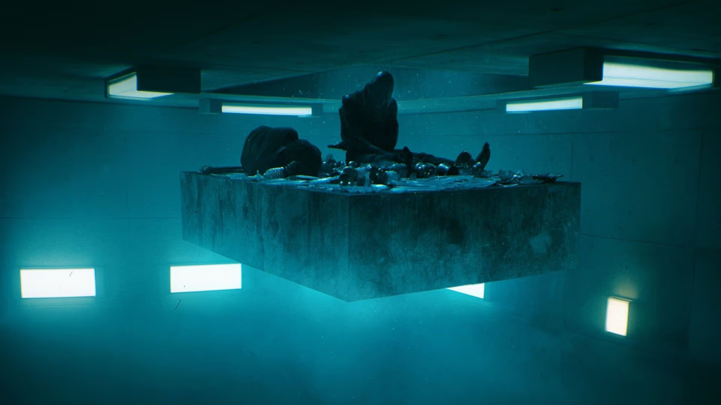 The Platform is a film by director Galder Gaztelu-Urrutia, from a script by David Desola and Pedro Rivero. It imagines a bleak world where a man named Goreng (Ivรกn Massaguรฉ) awakens to find himself in a hellish prison facility. Prisoners are paired off and arranged by floor in a stacked tower, running down to an unknowable depth. Once a day, a platform packed with food starts to descend from the top of the prison to the bottom, stopping for only two minutes before continuing down. That seemingly simple process actually creates a brutal social order of class warfare, wherein the prisoners on the top floors can raid the best food, leaving less and less for those below; they never have to see. By the time the platform reaches the bottom, there’s only crumbs and scraps for those in the darkest depths, creating a nightmare horde of ravenous marauders on the lower levels. As an inmate on Level 48, Goreng finds himself literally in the middle of the struggle, and quickly learns that the societal order isn’t as clean and ordered as it seems. Factions are forming, and those below are always scheming on ways to climb up and murder their way to a higher level in the food chain. And no one really knows what’s been brewing on the bottom floor, and could shake up the entire system, forever.