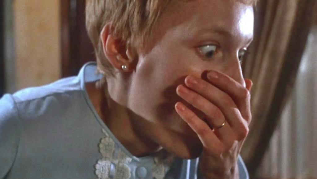 The film’s horrifying conclusion validates all of Rosemary’s worst fears. After giving birth, she is told the baby died, but she soon discovers her child alive in the neighbors’ apartment, surrounded by the coven. They reveal that she has given birth to the son of Satan, the Antichrist. Though initially horrified, Rosemary’s maternal instincts take over when she hears the baby crying. The final shot shows her rocking the demonic infant’s cradle, a quiet acceptance of her horrific fate and her role as the mother of evil.