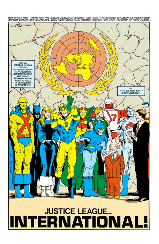 In Justice League International, businessman Maxwell Lord reorganized the heroes of the Justice League of America as an independent but United Nations-sanctioned international peace-keeping force. After the JLA was rechristened Justice League International, Batman stepped down from leading a team that included Guy Gardner, Black Canary, Blue Beetle, Booster Gold, Mister Miracle, Captain Atom, and Martian Manhunter.