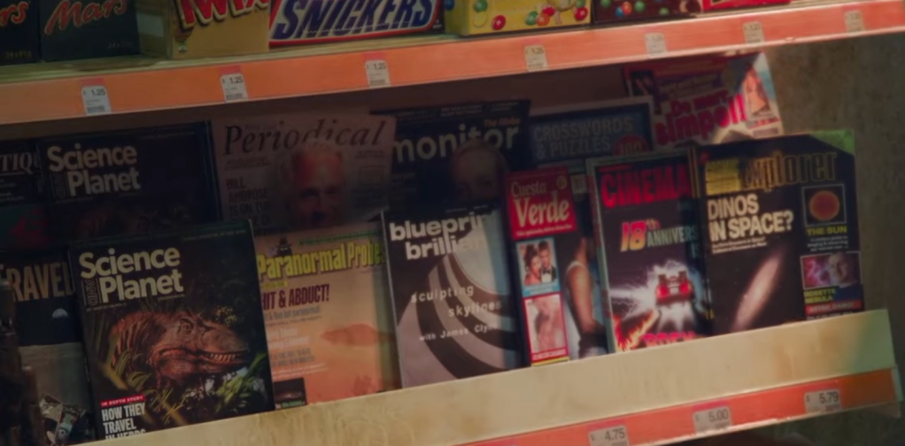 Look closely and you might spot an Amity Island postcard (from Jaws), a yellow raincoat (like the one worn by Sean Astin’s Mikey in The Goonies), a keychain replica flare (a nod to the flare Dr. Grant uses to ward off the T.rex in Jurassic Park), Isla Sorna Pure Costa Rican Spiced Rum (2001’s Spielberg-produced Jurassic Park III is set on Isla Sorna), and movie magazines covered by 1982’s Poltergeist and 1985’s Back to the Future (both produced by Spielberg).