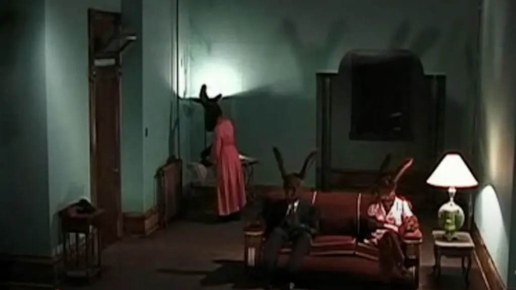 After a traumatic encounter with a client, a sex worker turns on the TV in her hotel room to watch a rather unusual show. The show features what appears to be a family of three anthropomorphic rabbits. They speak to each other in fragmented statements and questions as it continuously rains outside. The soundtrack consists of an eerie atmospheric drone accompanied by a sitcom laugh track that plays during non-humorous moments. The footage is actually part of a series of web shorts Lynch created, incorporating it into Inland Empire.