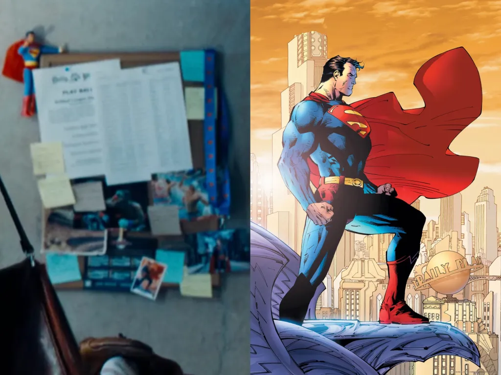 At The Daily Planet offices, we get a blink-and-you’ll-miss-it glimpse at a cork bulletin board that is decorated with Superman memorabilia. Posted to the board is a card of artist Jim Lee’s iconic cover for 2004’s Superman (Vol. 2) #204, the first issue of the 12-part Superman: For Tomorrow storyline written by Brian Azzarello and penciled by Lee. The fan-favorite artist also currently serves as Chief Creative Officer and Publisher of DC Comics.
